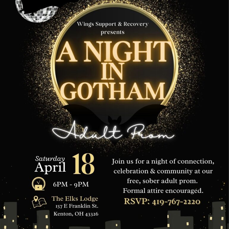 Wings - Support and Recovery Wings-Support and Recovery will present A Night in Gotham Adult Prom on Saturday, April 18. The free, sober adult prom will be a night of connection, celebration and community, and formal attire is encouraged. The event will run from 6:00 until 9:00 p.m. at the Kenton Elks Lodge, located at 157 East Franklin Street in Kenton. RSVPs can be made by calling 419-767-2220.