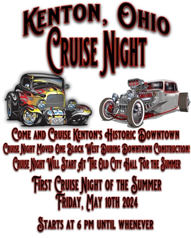 Credit: Old City Hall Antique Mall Despite construction, Cruise Night is back in downtown Kenton. After doing some figuring, Cruise Night will be moved one block to the West. Detroit, Columbus, Franklin and Market Streets will be the new Square while the downtown construction is going on. The first Cruise Night of the Summer will be this coming Friday, May 10th starting at 6 pm.