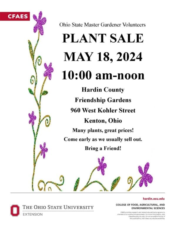 The 19th Annual Hardin County Master Gardener Plant Sale will be held Saturday May 18. It will be held rain or shine from 10:00 am until noon that day at the Friendship Gardens of Hardin County located behind the old HARCO Workshop Building at 960 West Kohler Street in Kenton. In addition to plants and garden items supplied by the Hardin County OSU Extension Master Gardener Volunteers, the Hardin County Men’s Garden Club will be at the annual event with plants for sale.