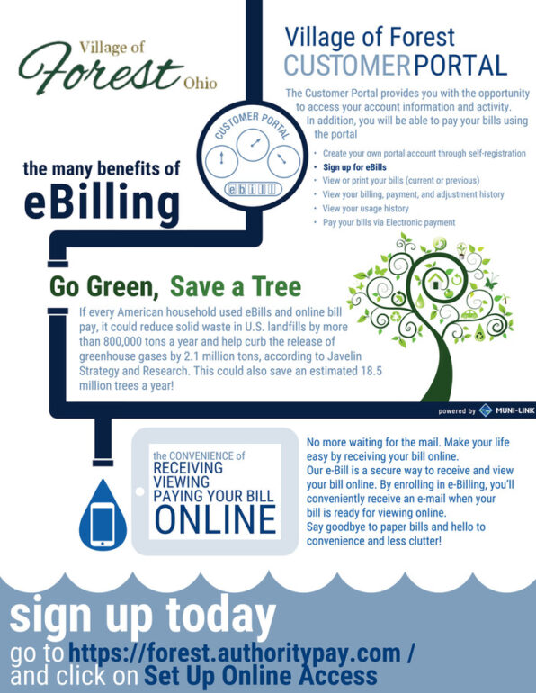 Village of Forest The Village of Forest is officially live with the new utility billing program. Village officials said that an email has been sent out to users with instructions on how to sign up to view and pay your bills online.  Information is also posted at villageofforest.com. Residents who have any questions or issues regarding their account can call 419-273-2500.