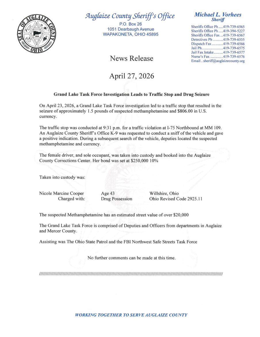 The Auglaize County Sheriff’s Office released information Monday on a Grand Lake Task Force investigation from last week.