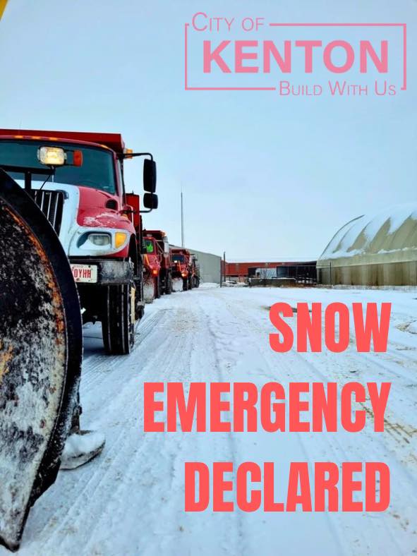 Effective immediately, the City of Kenton has declared a Snow Emergency due to current weather conditions and hazardous roadways.