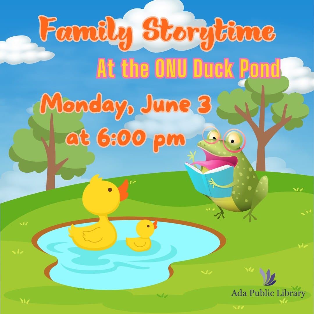 The Ada Public Library is hosting a family story time event at the ONU Duck Pond on Monday, June 3rd at 6:00pm until 7:00pm.