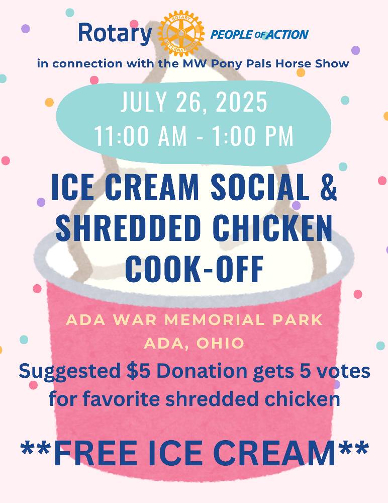 The Ada Rotary Club is hosting an ice cream social and shredded chicken cook-off next month.