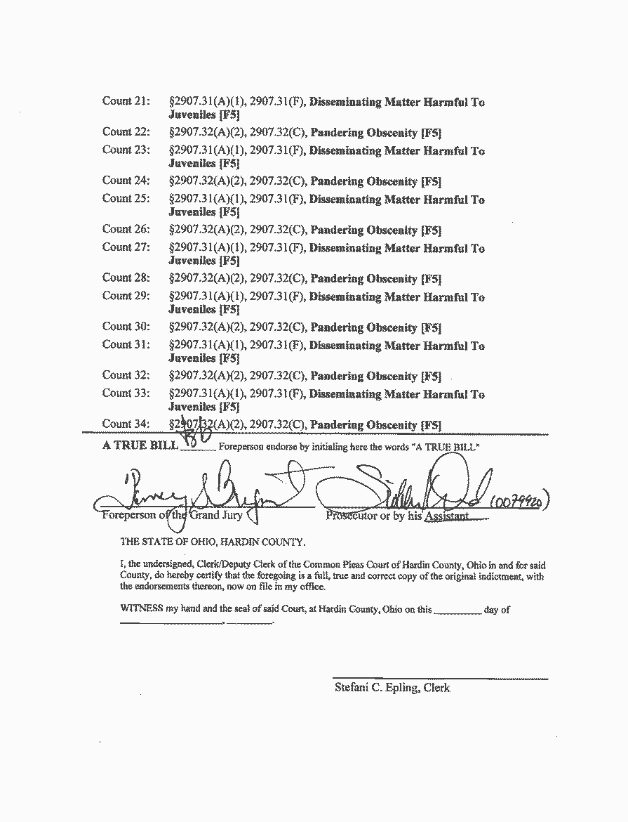 A Forest woman was indicted recently on 17 counts of disseminating matter harmful to juveniles and 17 counts of pandering obscenity.