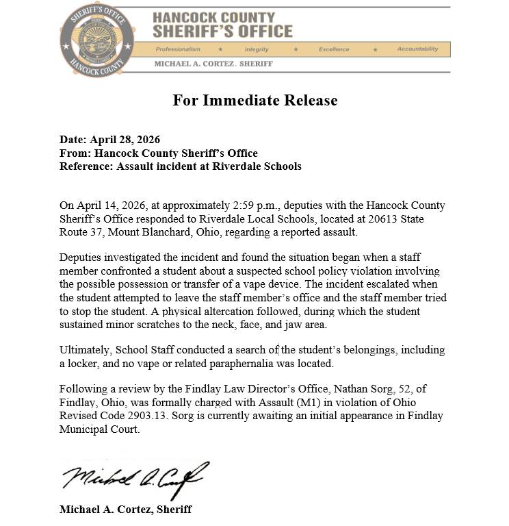 According to a release, on April 14, 2026, at approximately 2:59 p.m., deputies with the Hancock County Sheriff’s Office responded to Riverdale Local Schools, located at 20613 State Route 37, Mount Blanchard, Ohio, regarding a reported assault.