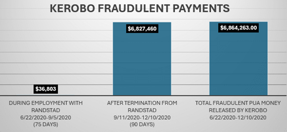 Though Kerobo was terminated after working for Randstad for 75 days, his login credentials were not deactivated and Kerobo continued making unauthorized changes to and adjudicating PUA claims for three more months. Kerobo fraudulently released $6,864,263 in improper PUA benefits, $6,827,460 of which were released after his employment was terminated.