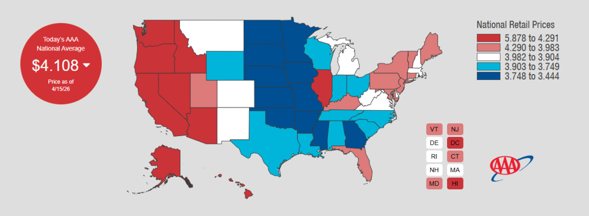 According to AAA, the average U.S. price is $4.10 a gallon today, which is a decrease of six cents since last Wednesday.