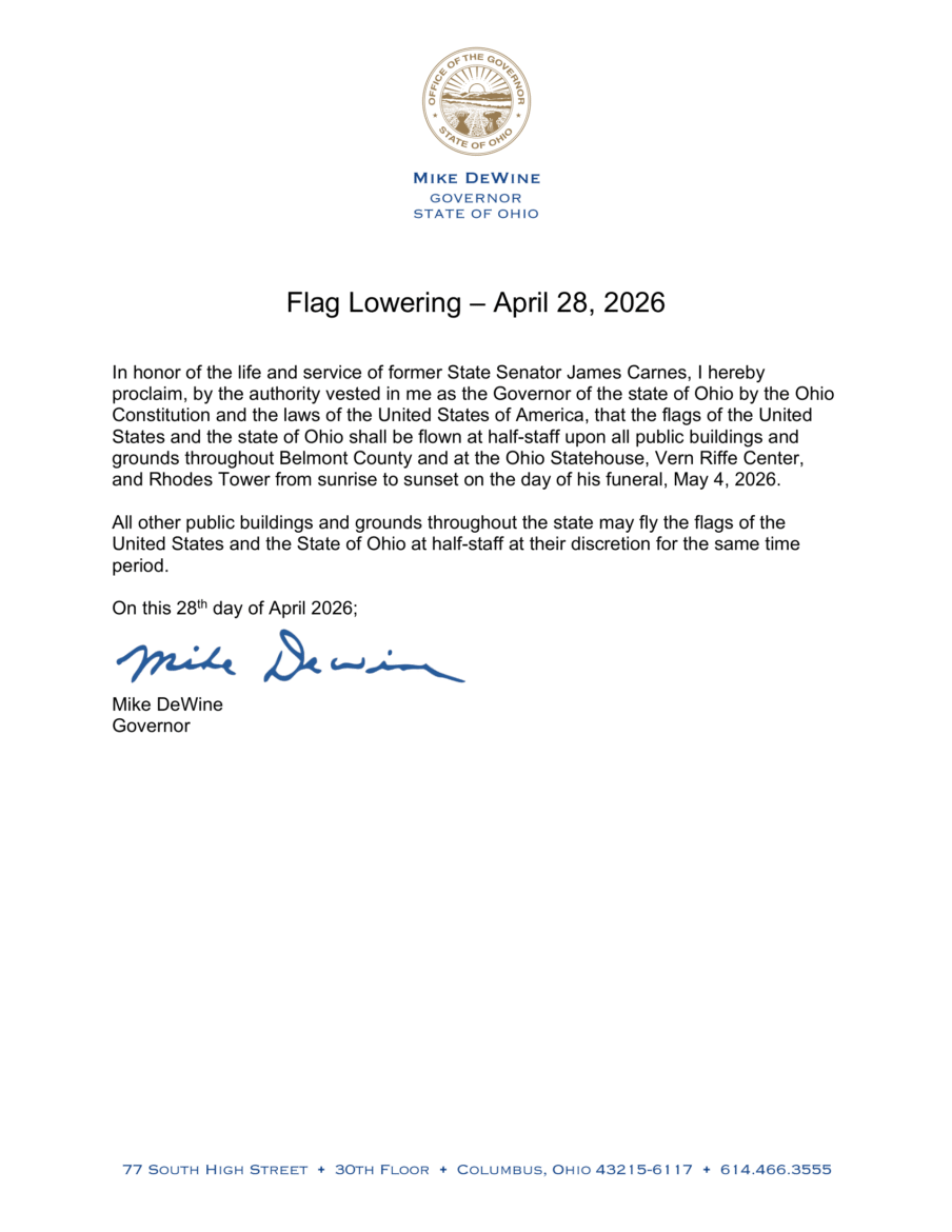 (COLUMBUS, Ohio)—In honor of the life and service of former State Senator James Carnes, Governor Mike DeWine has ordered that the flags of the United States and the state of Ohio shall be flown at half-staff upon all public buildings and grounds throughout Belmont County and at the Ohio Statehouse, Vern Riffe Center, and Rhodes Tower from sunrise to sunset on the day of his funeral, May 4, 2026.