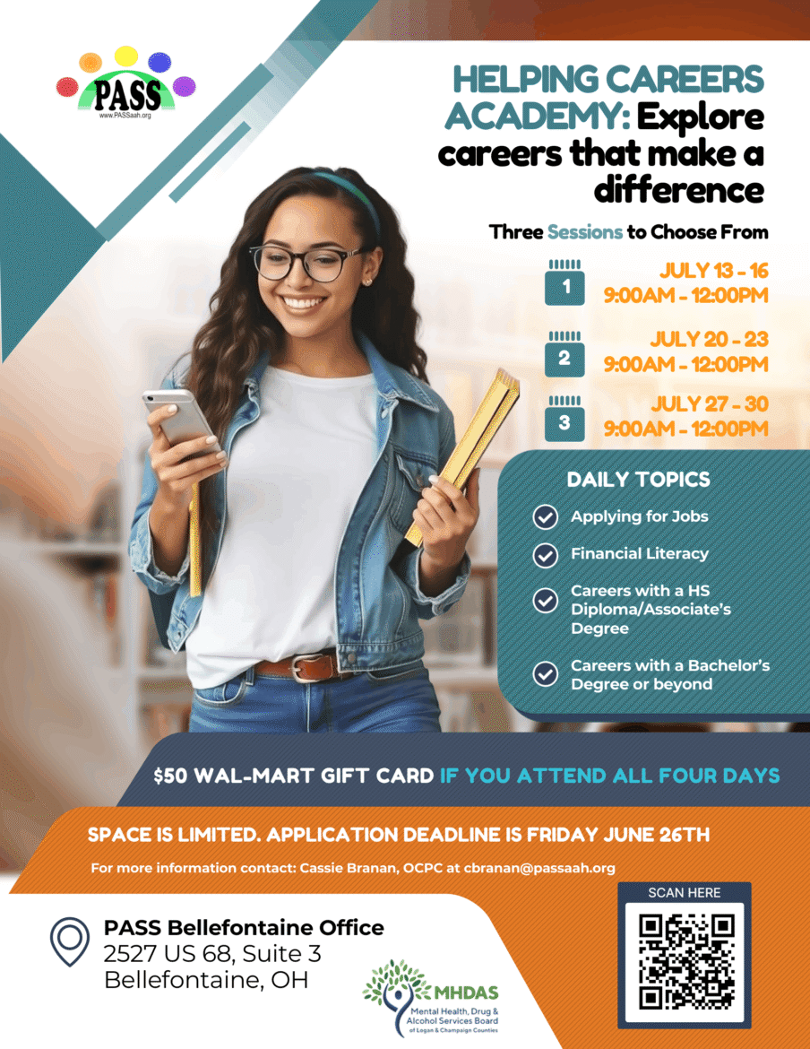 The Helping Careers Academy is offering a free four‑day summer program for area students currently in 8th grade through current high‑school seniors, running from 9 AM to 12 PM with sessions available July 13–16, July 20–23, or July 27–30 at the PASS Bellefontaine Office.