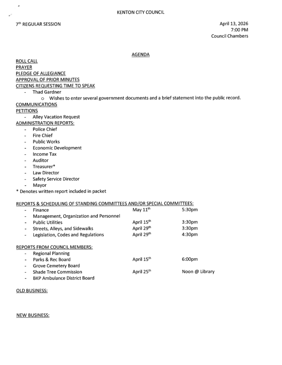 The seventh regular session of the year will start at 7 p.m. in the Kenton City Building.