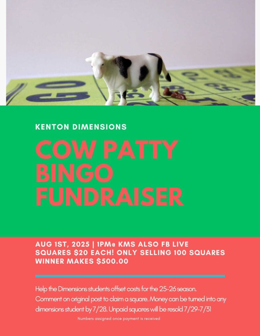 Kenton Middle School Dimensions Show Choir is holding a Cow Patty Bingo Fundraiser on August 1.