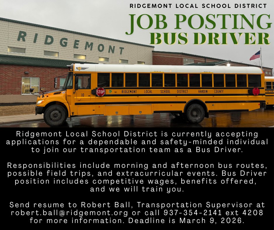 Ridgemont Local School District is currently accepting applications for a Bus Driver.