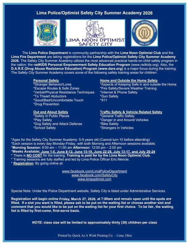 The Lima Police Department and Lima Noon Optimist Club’s Safety City Summer Academy is set to return this summer.