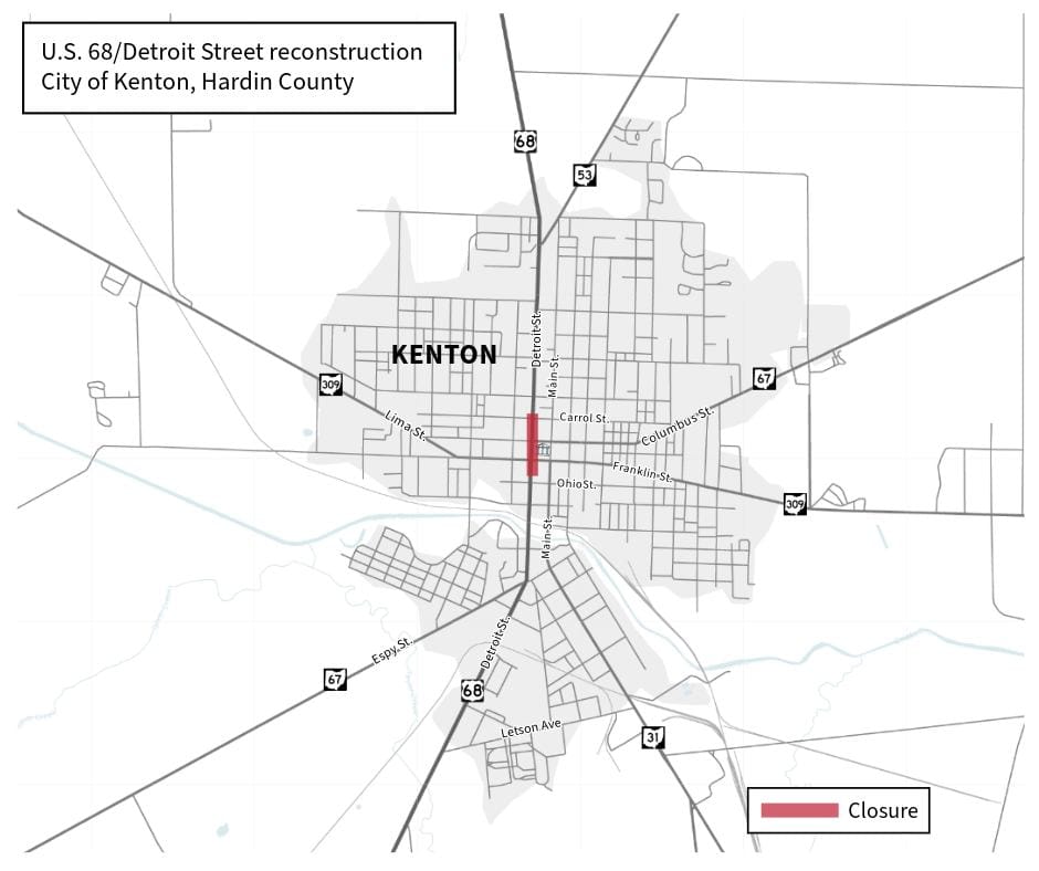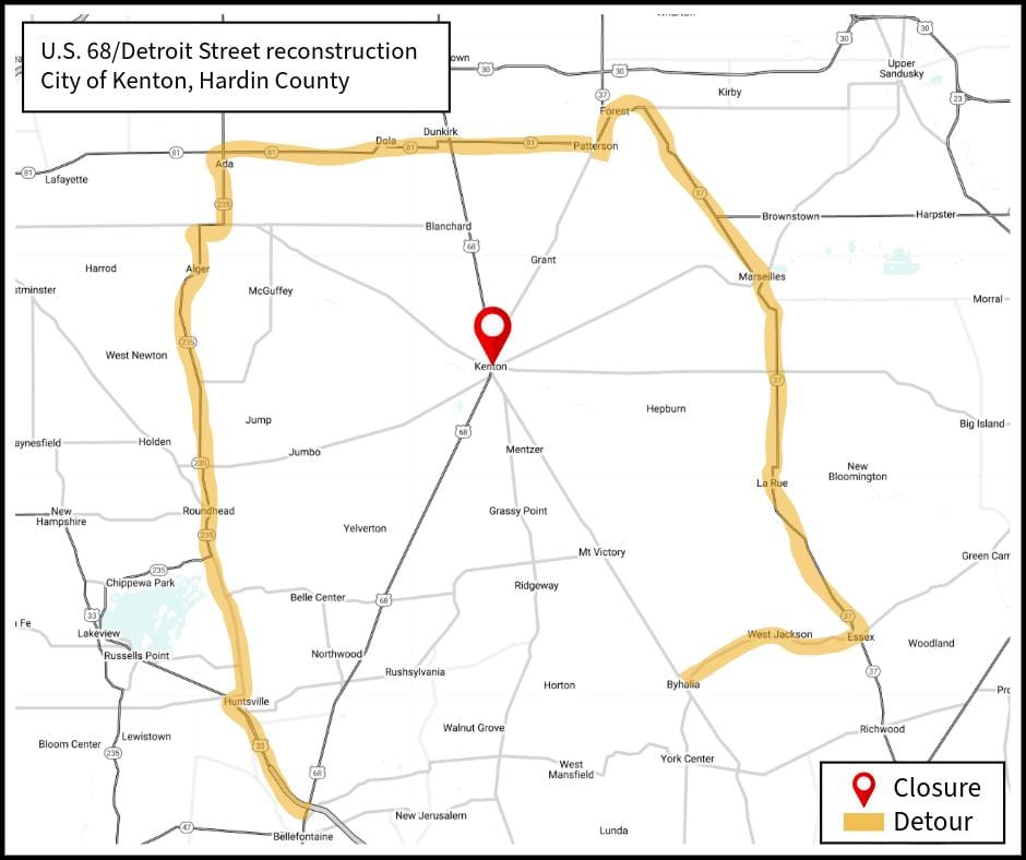 -U.S. 68 detour: SR 701 to SR 235 to SR 117 to U.S. 33, back to U.S. 68