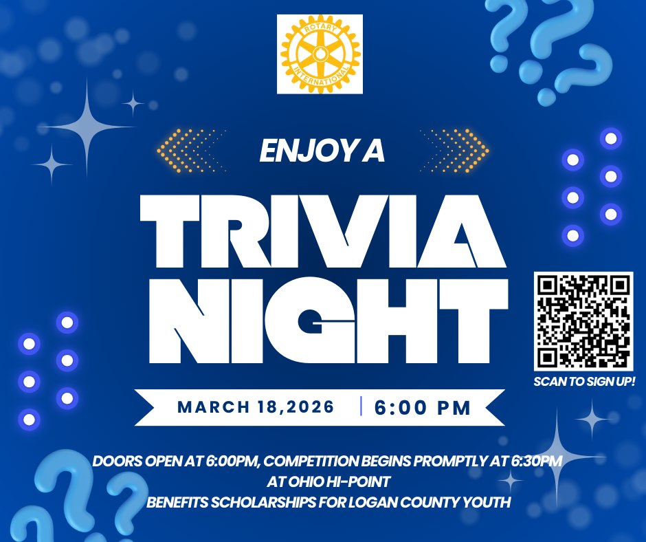 The Bellefontaine Rotary Club invites the community to a fun evening of trivia competition on Wednesday, March 18, 2026, at the Ohio Hi-Point Cafeteria.