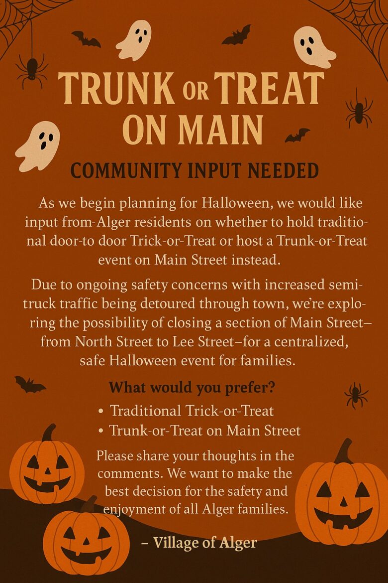 Village of Alger officials are asking Alger residents for their input concerning Halloween.
