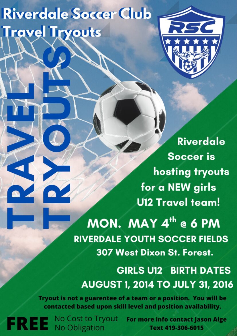 Riverdale will be hosting a no-fee tryout for a new girls’ U12 soccer team on May 4th. The tryout will take place at the Riverdale youth soccer fields in Forest at 6 PM.